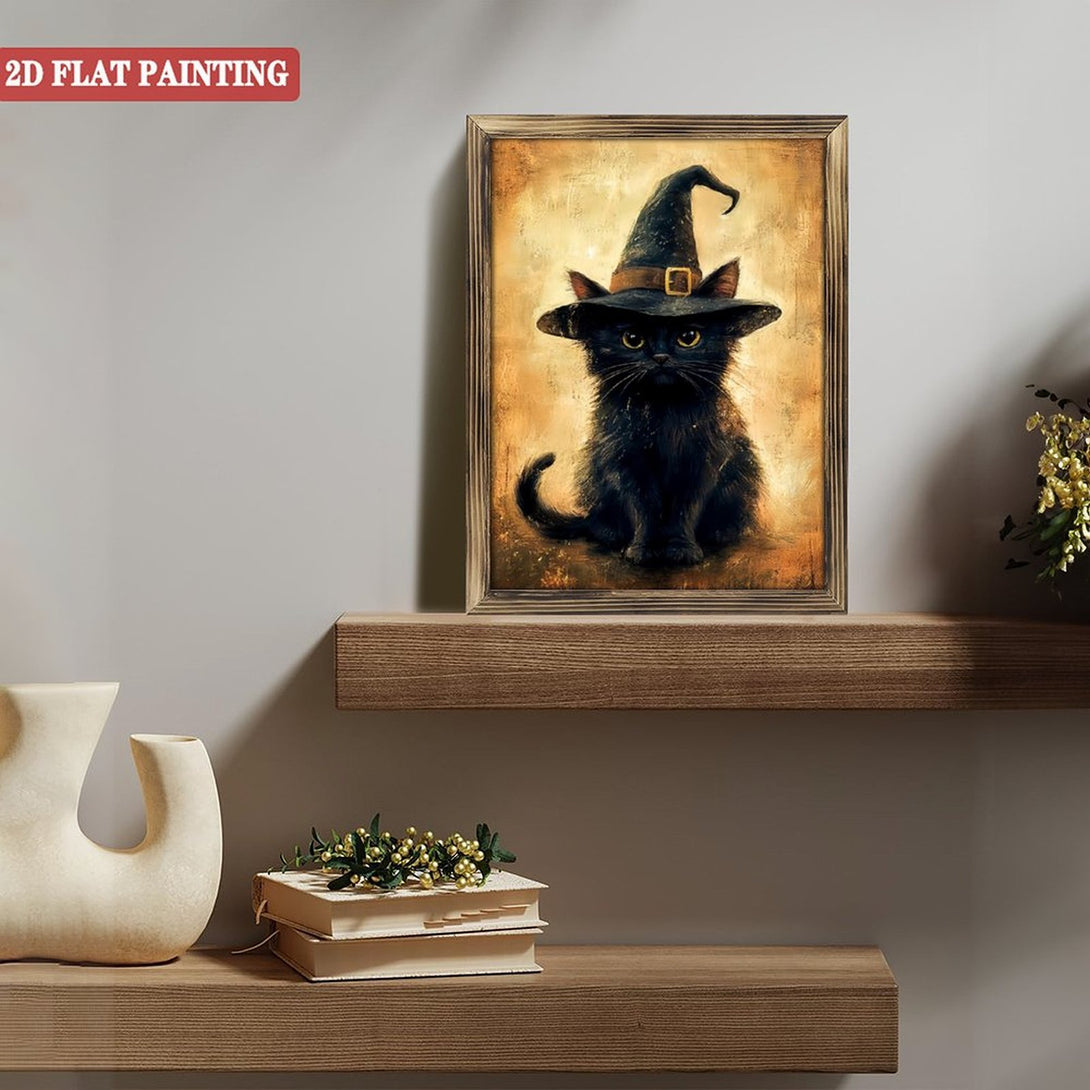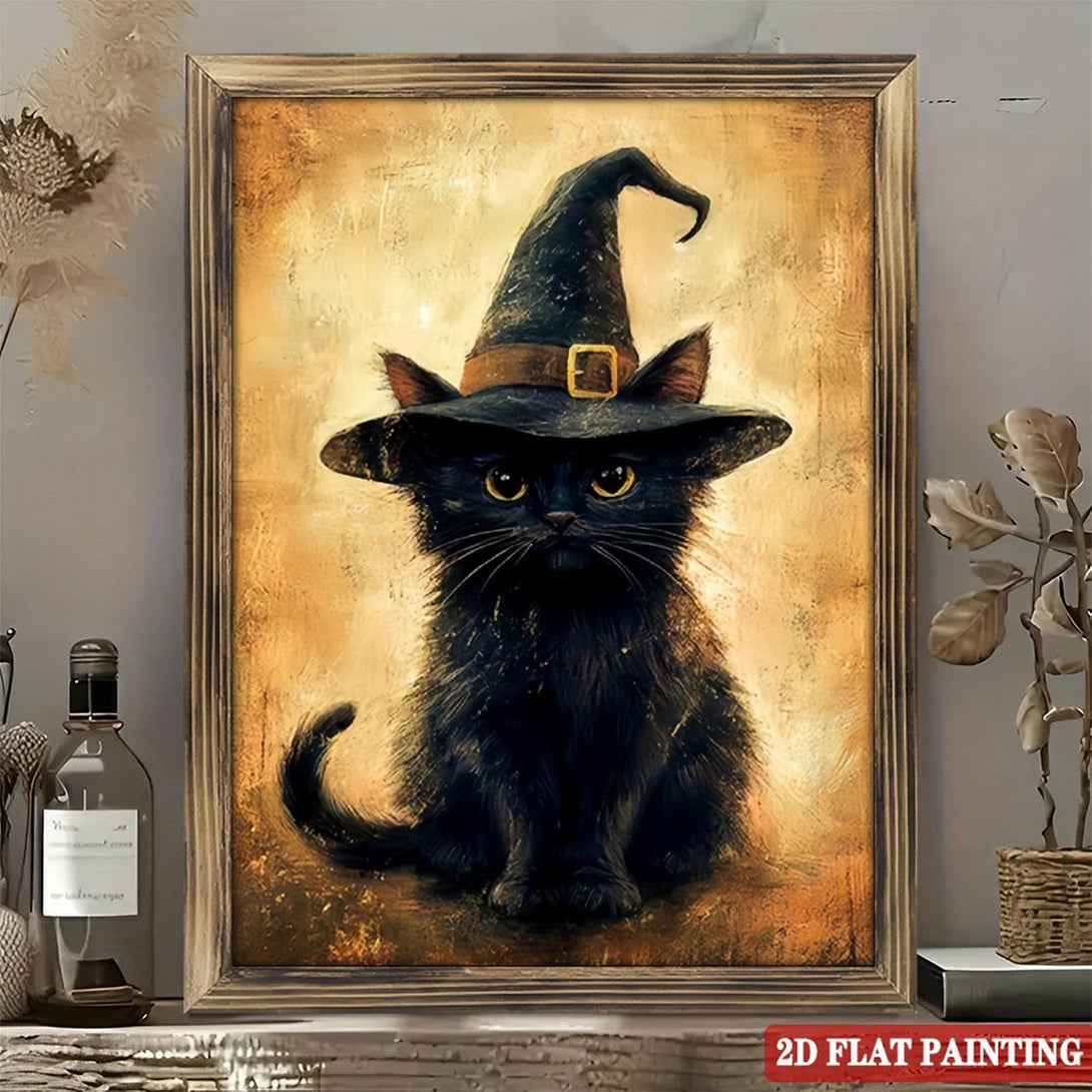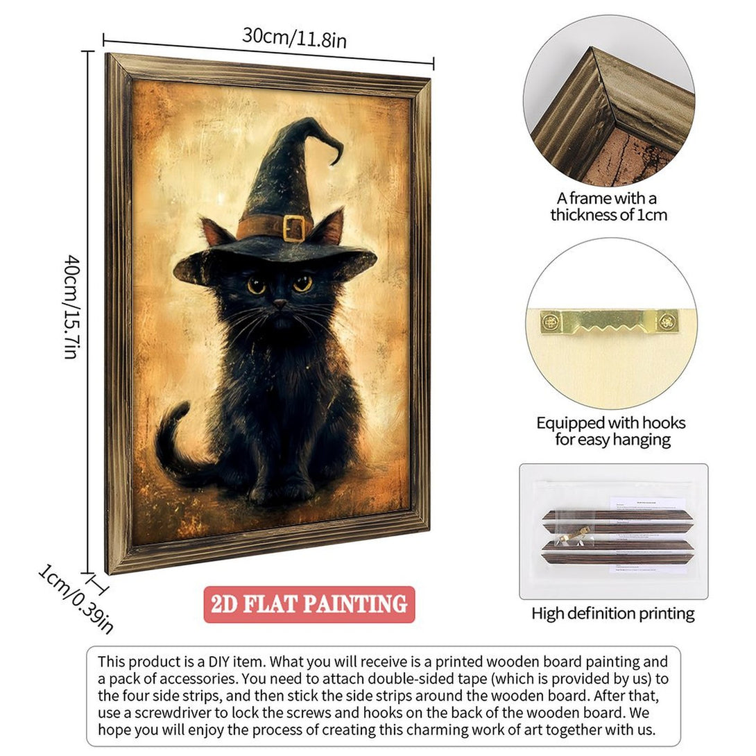 ,Black Cat in Witch Hat Wood Art Prints, Gothic Halloween- Academia Decor.for Living Room, Kitchen, Bedroom And Office.for Gift Home Wall Decor.