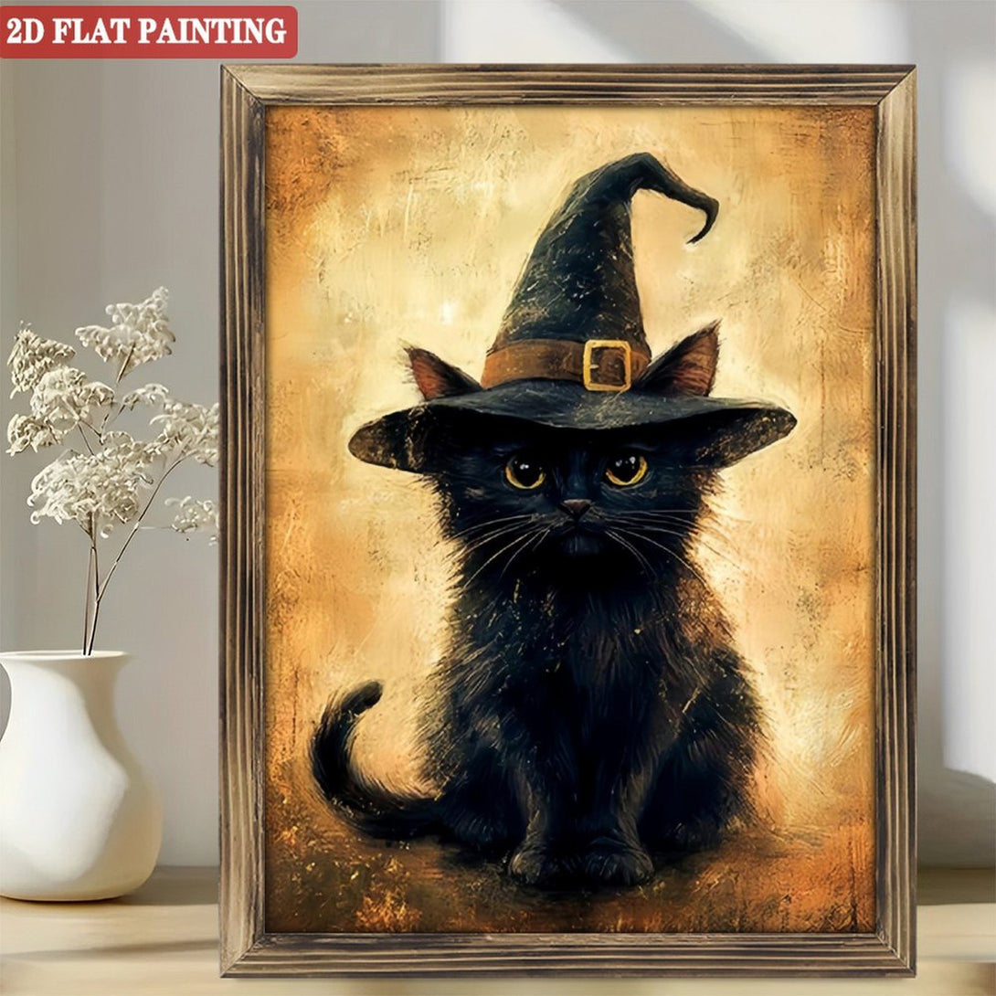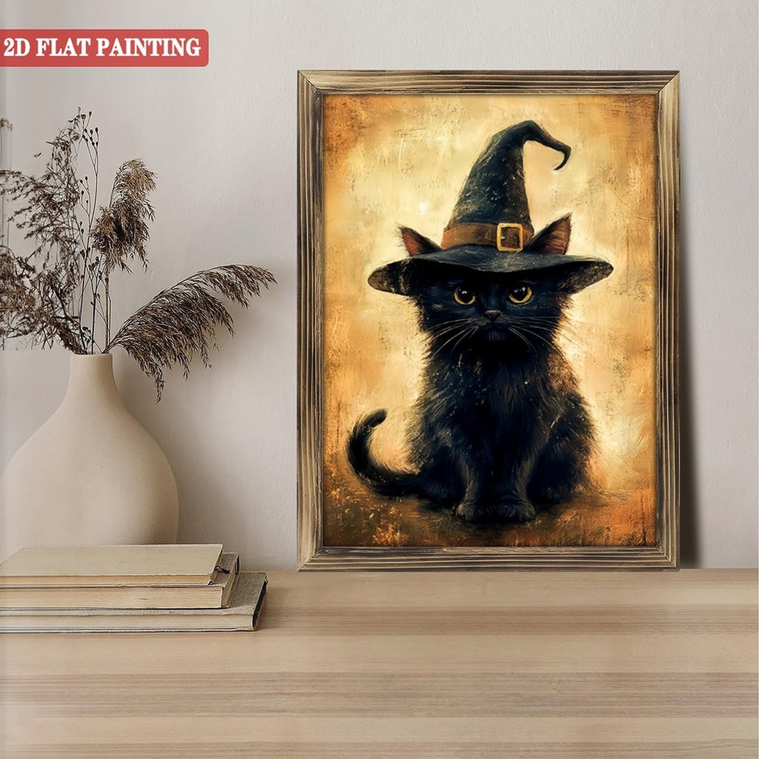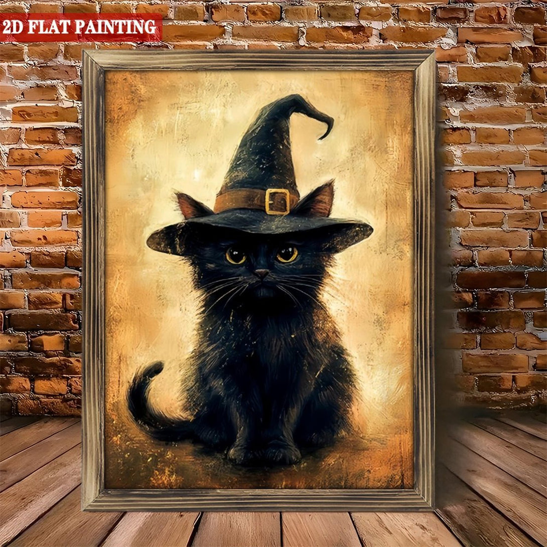,Black Cat in Witch Hat Wood Art Prints, Gothic Halloween- Academia Decor.for Living Room, Kitchen, Bedroom And Office.for Gift Home Wall Decor.