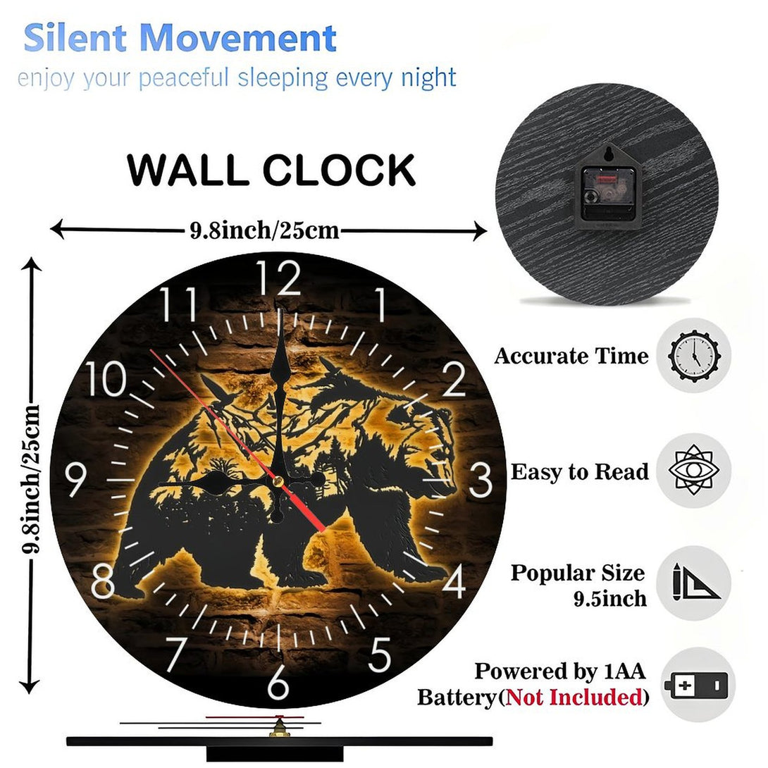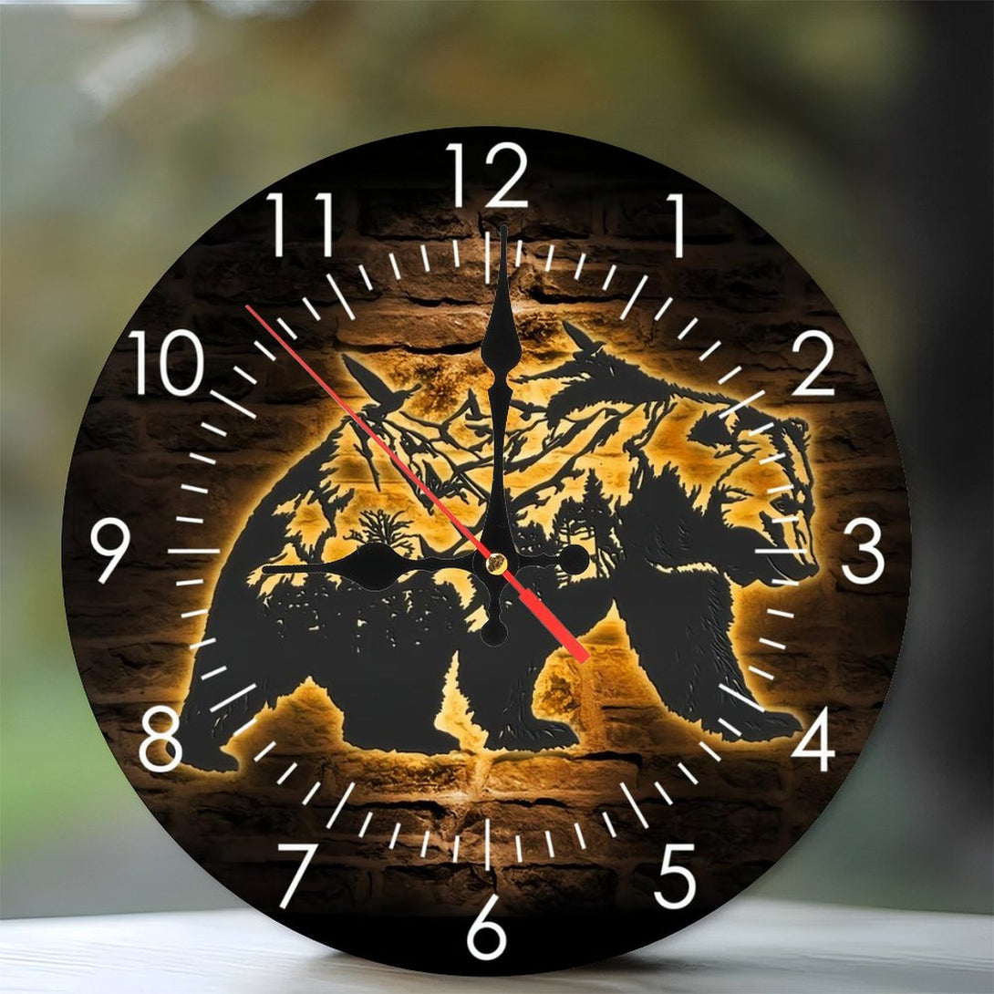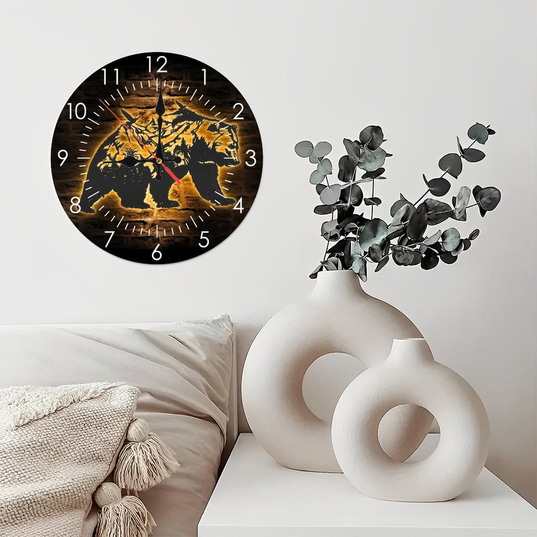 Round Wooden Wall Clock 25*25CM 1-8 Mountain Bear Glass Wall Clock, Bear And Forest Glass Wall Clock,Home Decor Trees Grizzly Bear WildLife Decoration Christmas Housewarming Gift 10×10inch(25×25cm)
