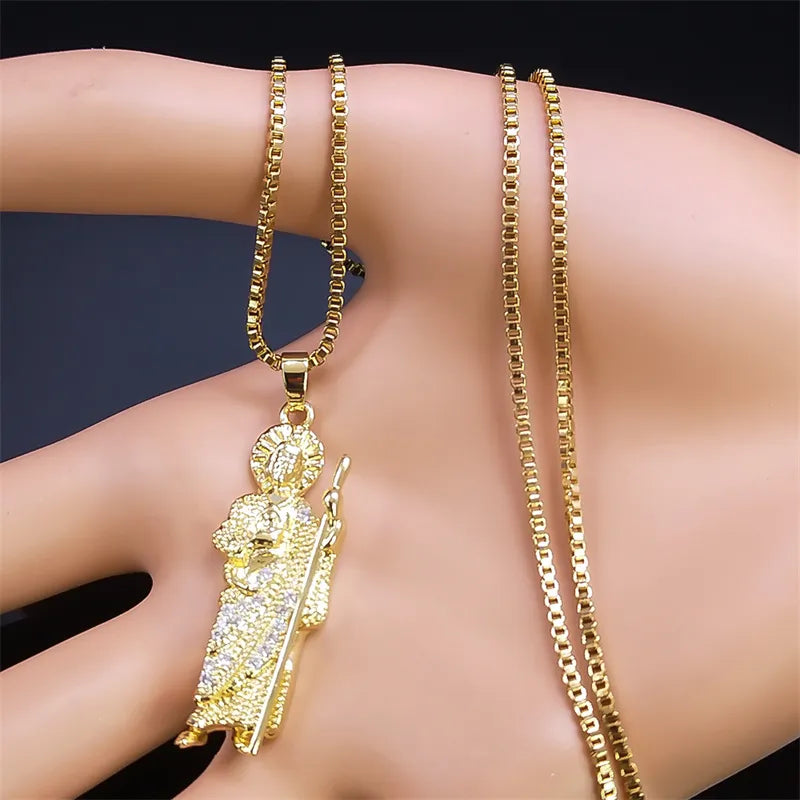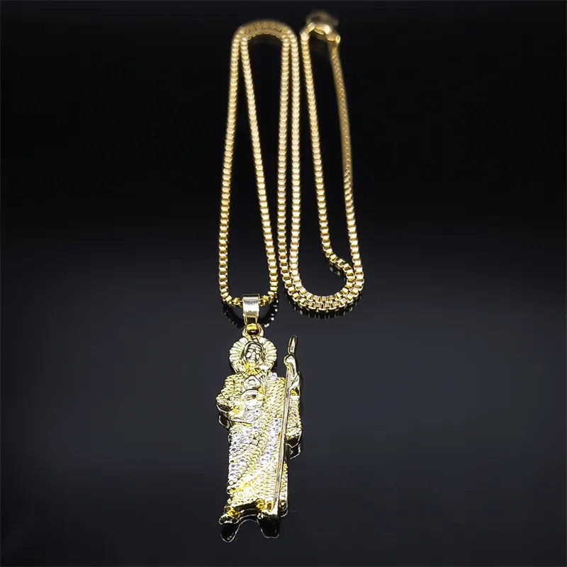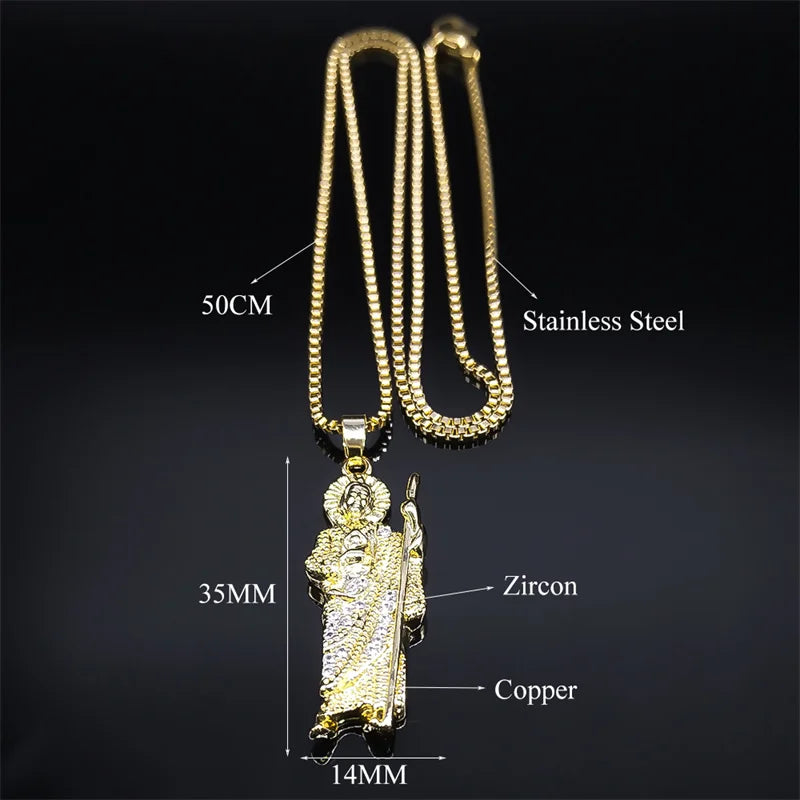 San Judas Tadeo Zircon Copper Pendant Necklace for Women Men Stainless Steel Chain