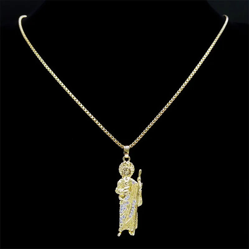 San Judas Tadeo Zircon Copper Pendant Necklace for Women Men Stainless Steel Chain Saints Apostle of Jesus Necklace Jewelry Gift