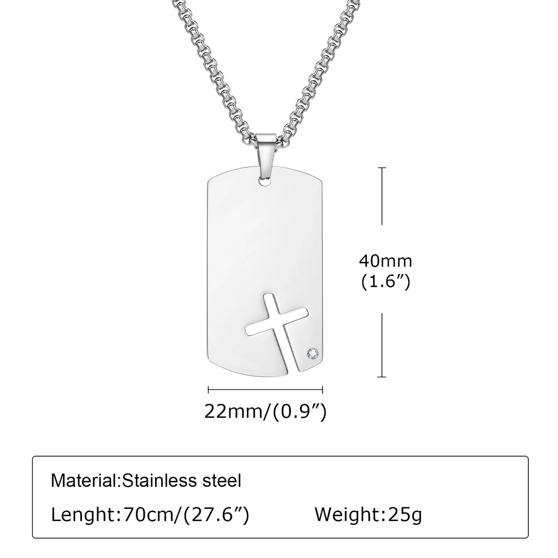 Side Cross Dog Tag Necklaces for Men,Waterproof Stainless Steel Pendant Collar with Cubic Zirconia,Box Chain 70cm