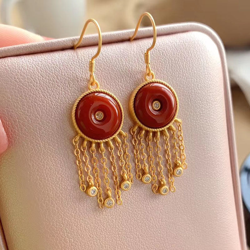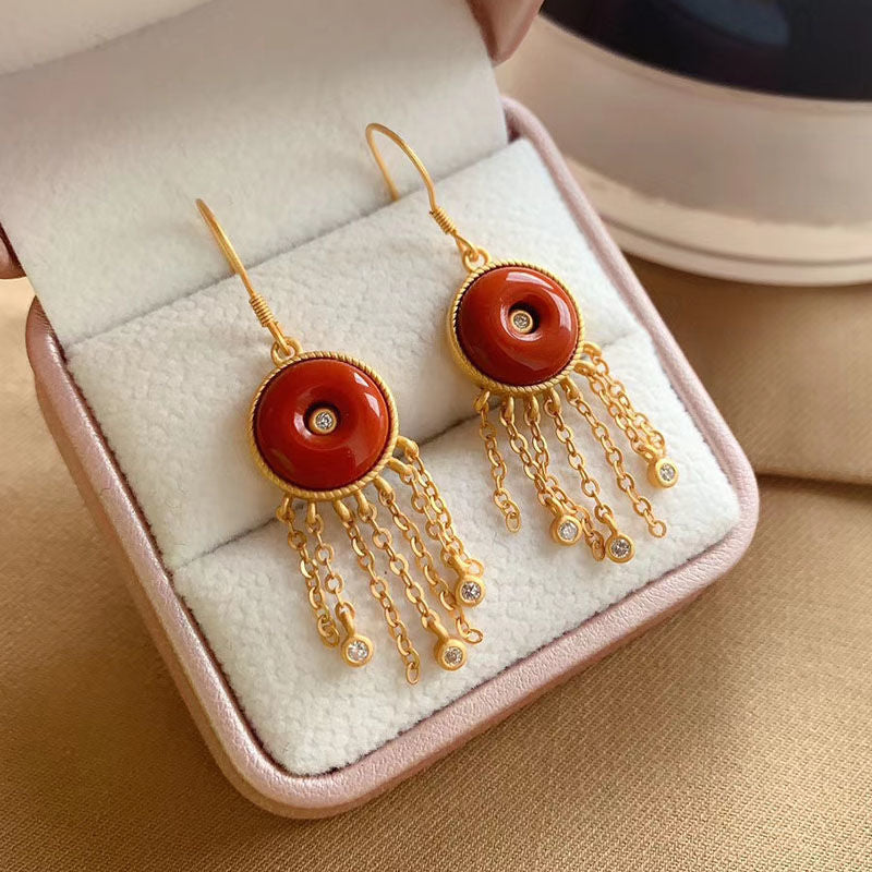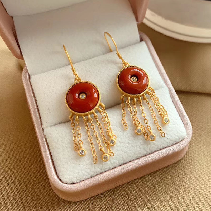 Silver Inlaid Natural Hetian Jade Chinese Tassel South Red Tourmaline Earrings