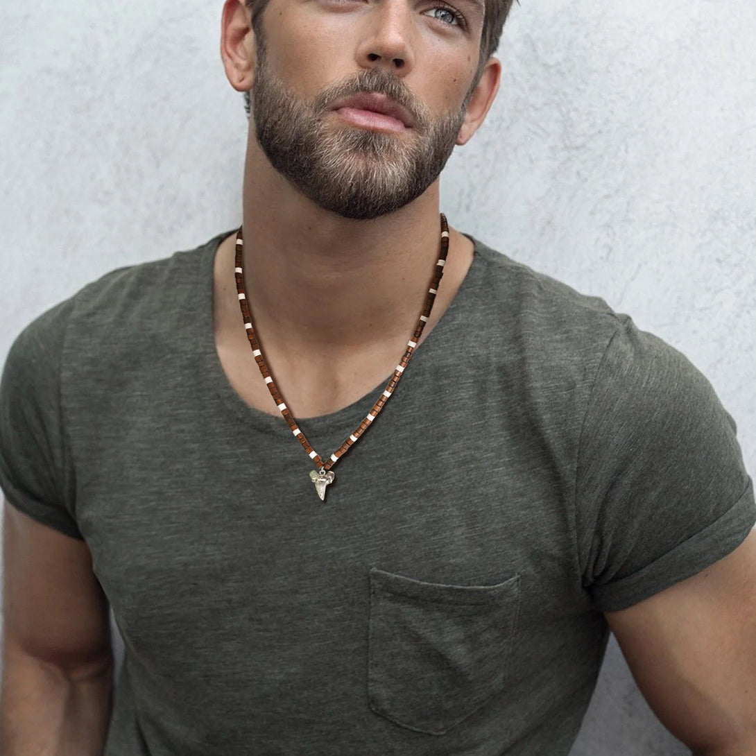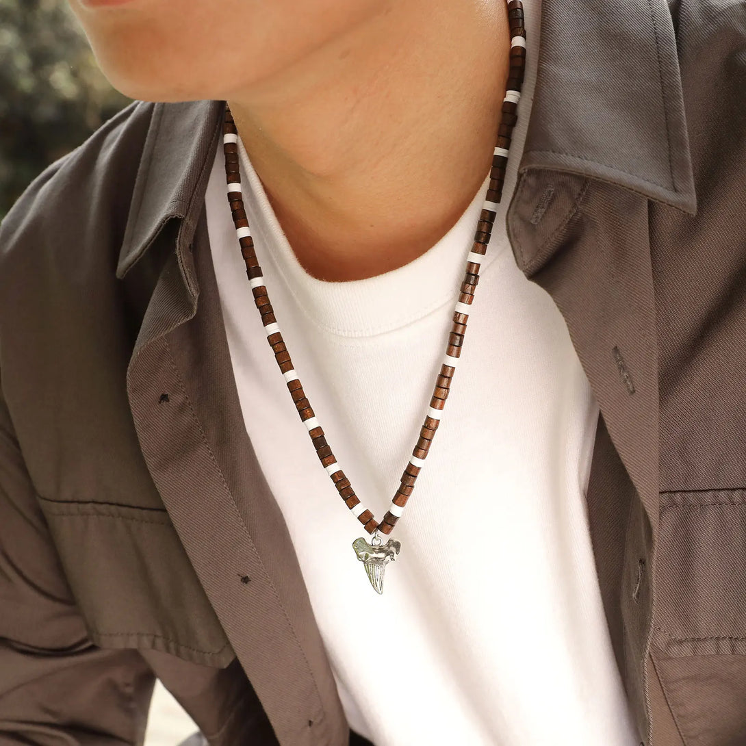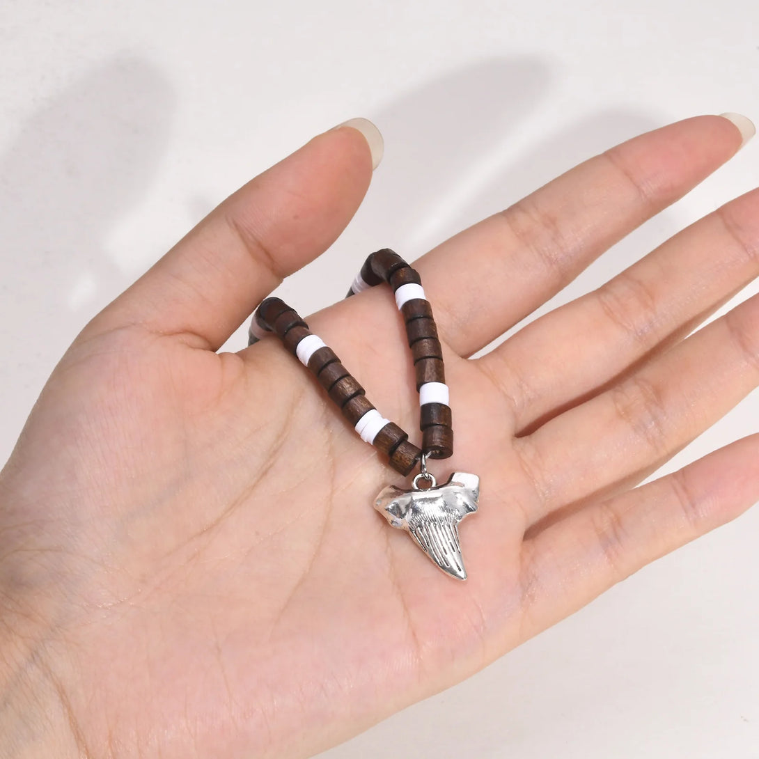 Simple Shark Teeth Pendant Necklace for Men Boys,Natural Coconut Shell Soft Clay Wood Beaded Choker,Animal Jewelry