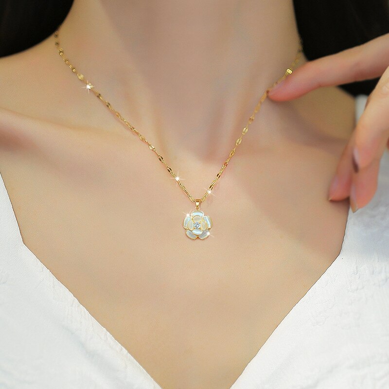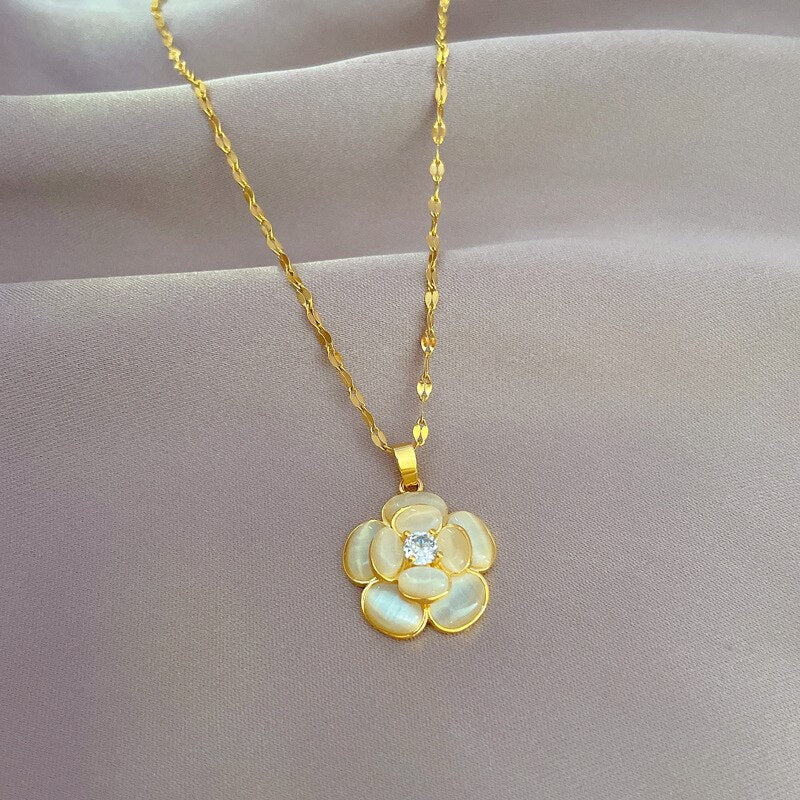 Stainless Steel Classic Gold Color Elegant Opal Camellia Necklace For Women