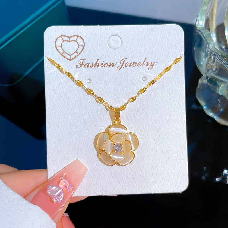585 Gold Jewelry-Stainless Steel Classic Gold Color Elegant Opal Camellia Necklace For Women Jewelry Flower Pendant Necklace Birthday Gift