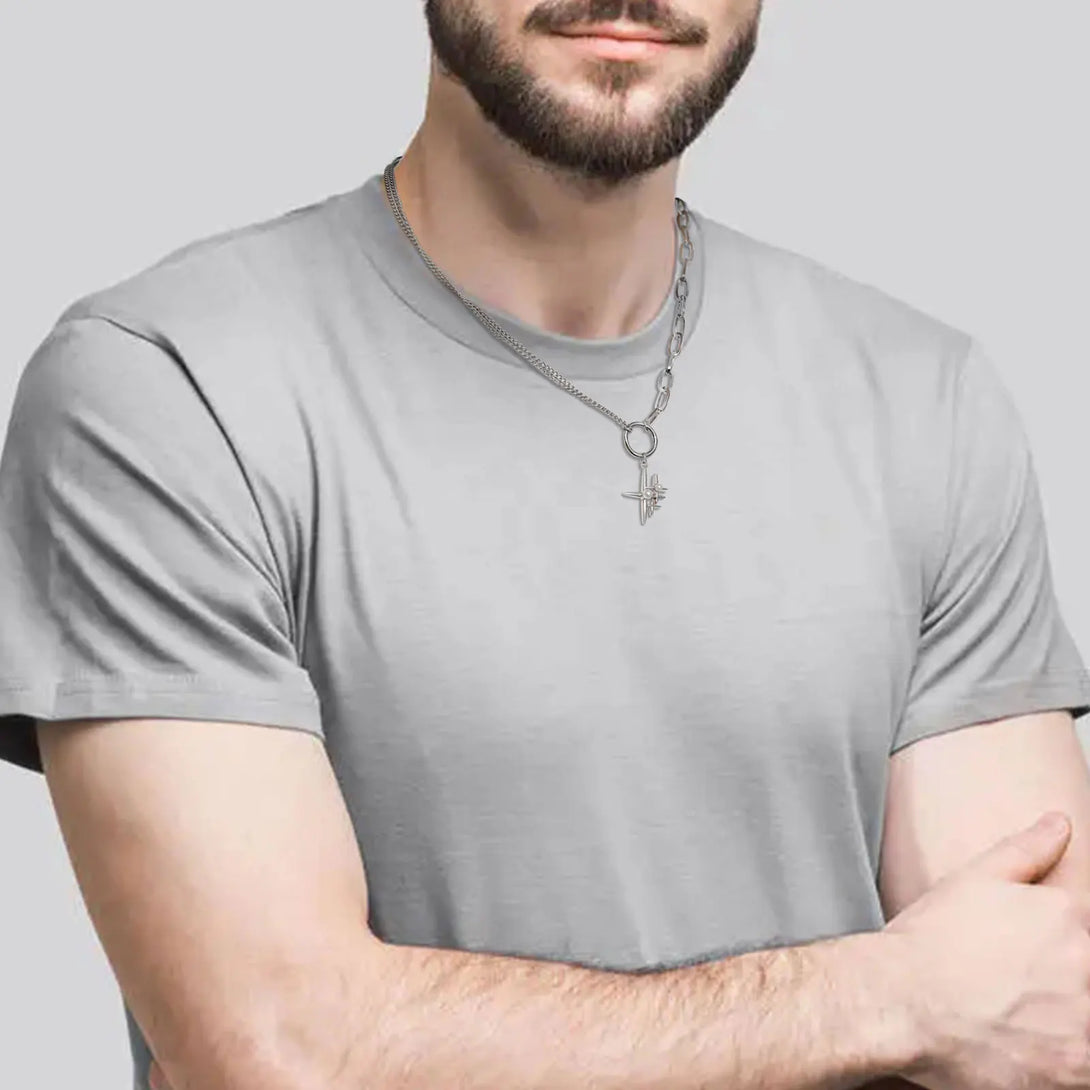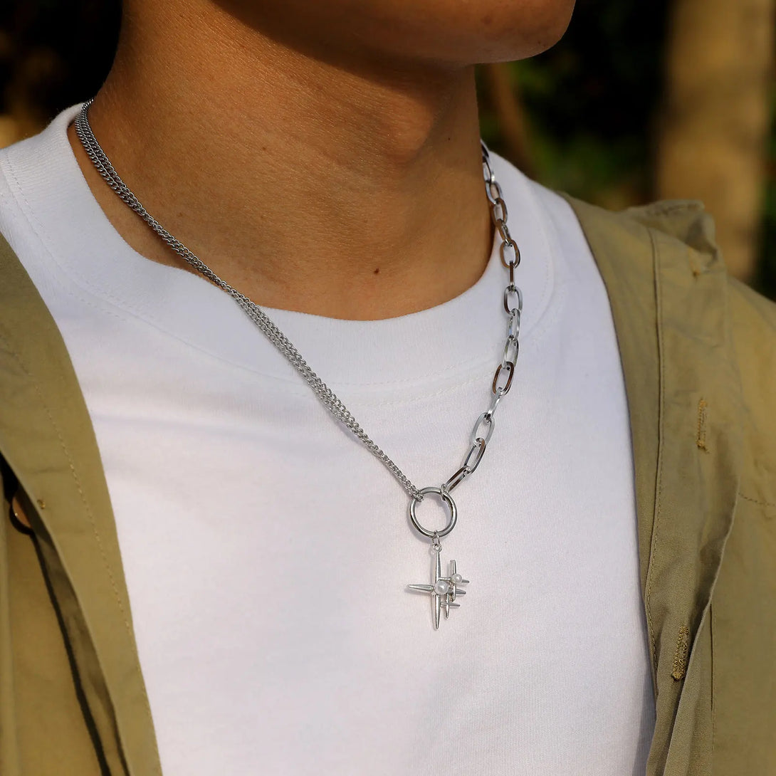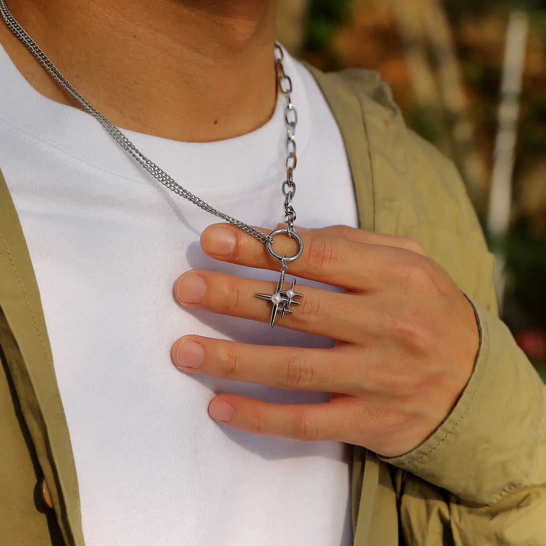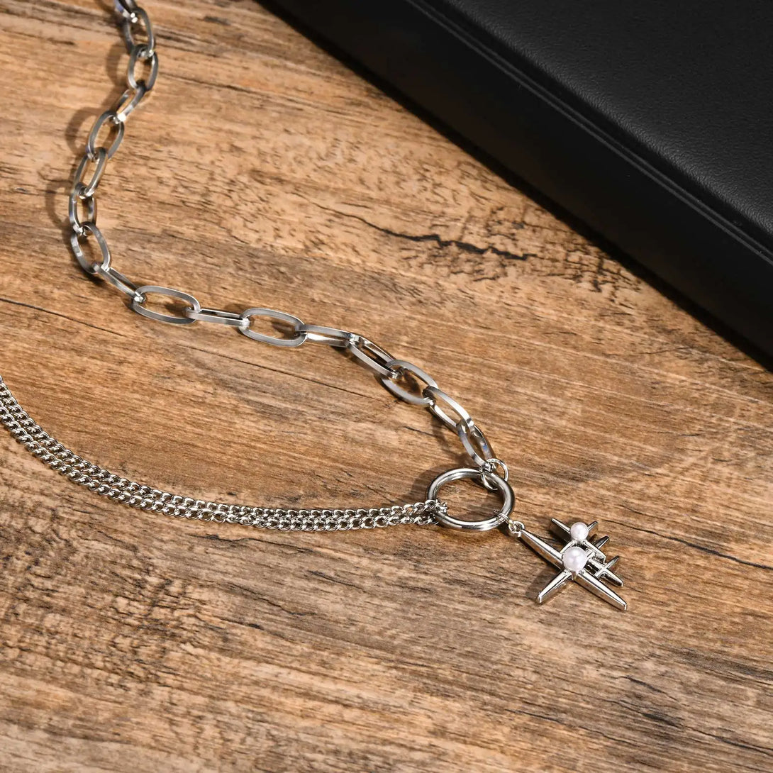 Star Cross Pendants for Men Women,Stacking Four Stars Simulated Pearl Inlayed,Stylish Twisted Link Square Chain Collar
