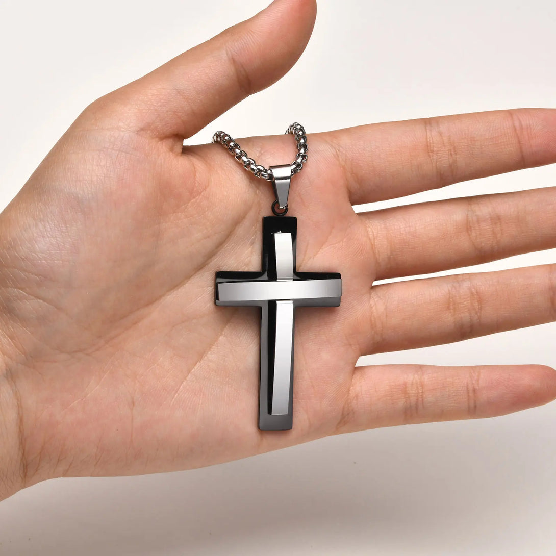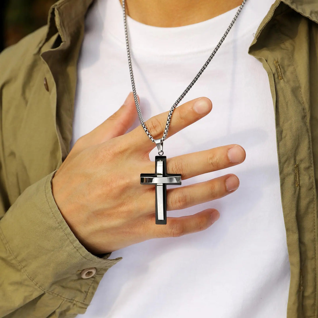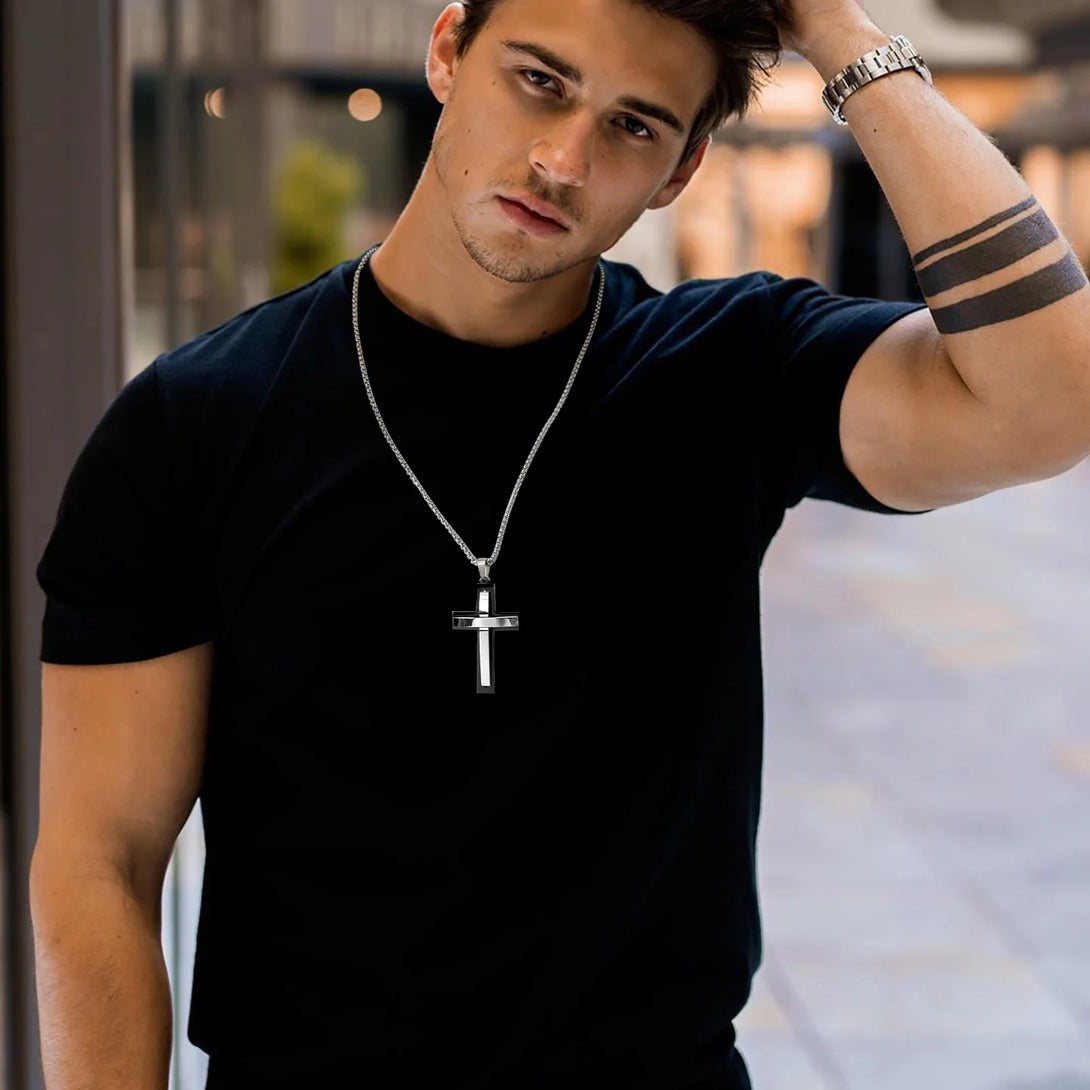 Stylish Layers Cross Necklaces for Men Boys,Two Tones Black Silver Color Cross Pendant