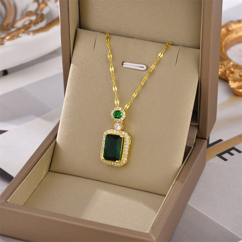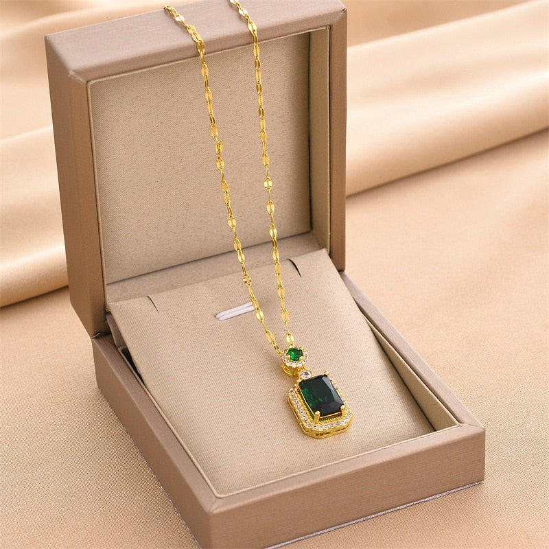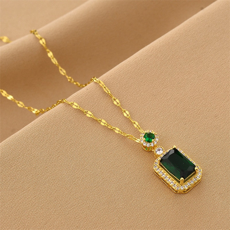 585 Gold Jewelry-316L Stainless Steel Temperament Green Red Imitation Gemstone Square Pendant Necklace For Women Girl Wedding Party Gifts