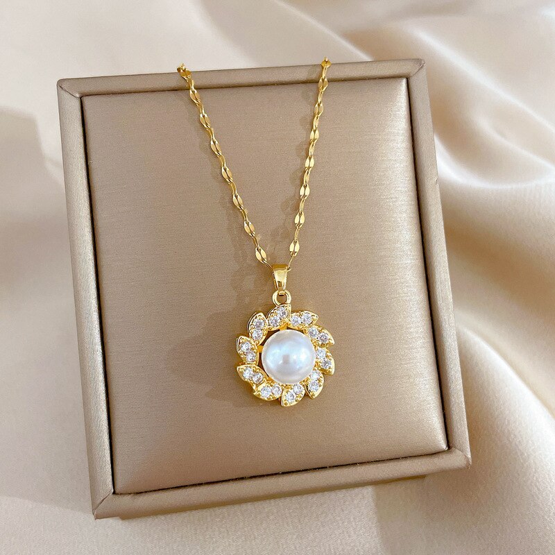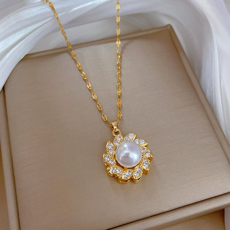 585 Gold Jewelry-Titanium Steel Gold Plated New Design Big Pearl Flower Pendant Luxury Jewelry Temperament Collarbone Chokers