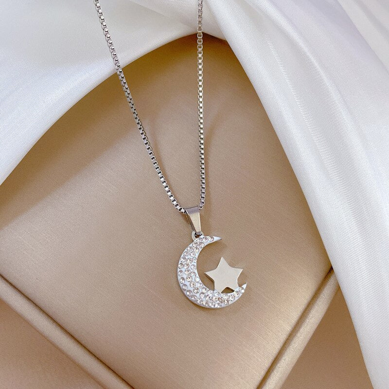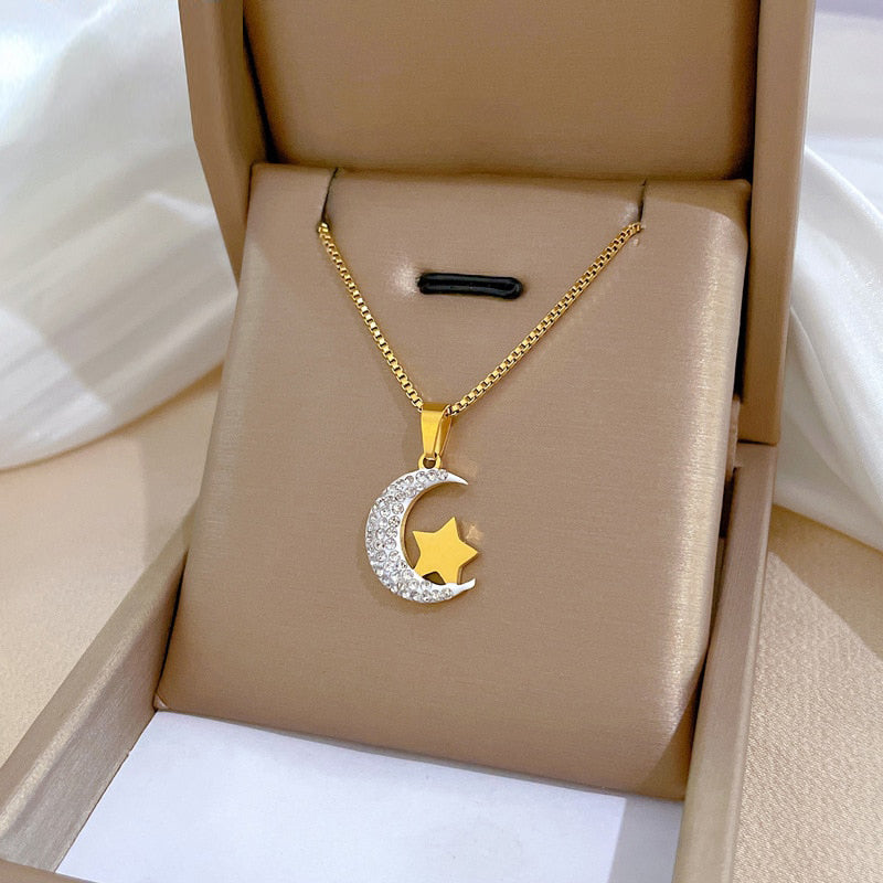 Titanium Steel No Rust Inlay Cubic Zirconia Stone Moon Star Pendant Necklace for Women