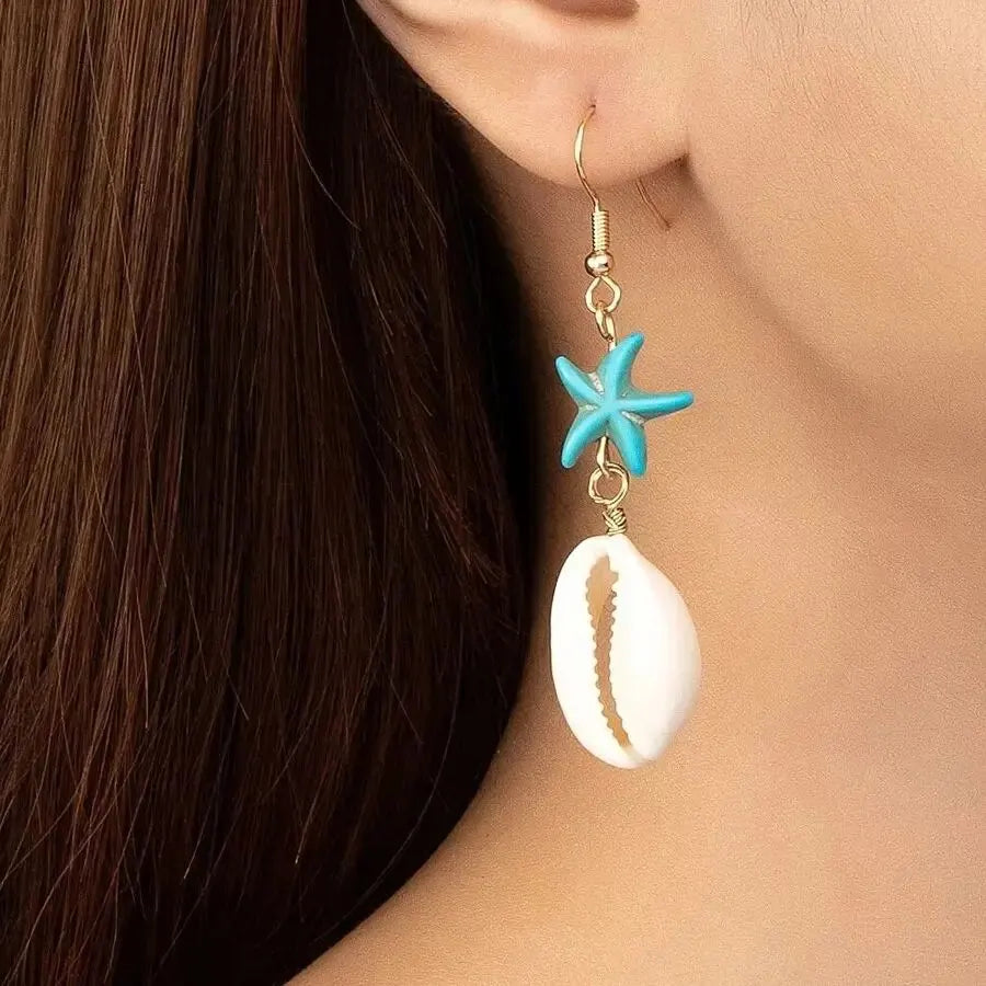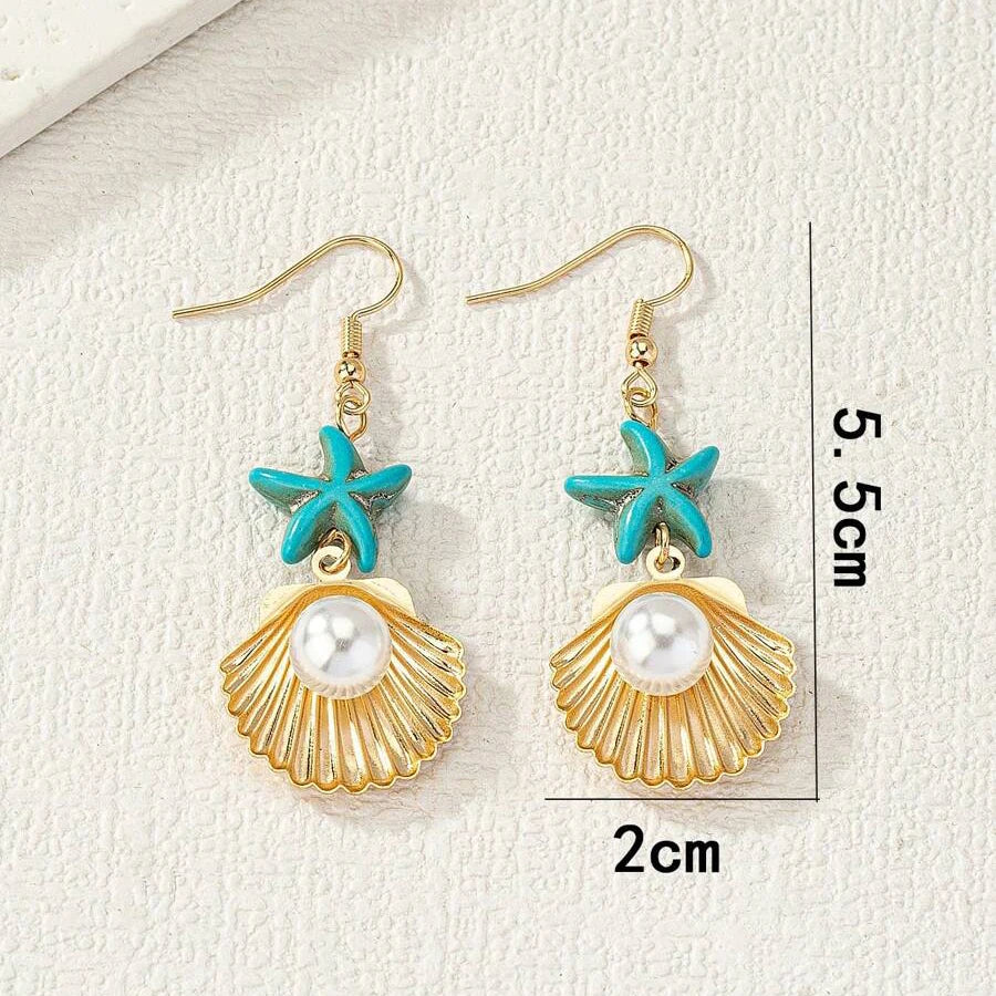 Turquoise Stone Blue Starfish Shell Drop Earrings Dainty Imitation Pearl Fish Hook Earrings For Woman Summer Beach Jewelry
