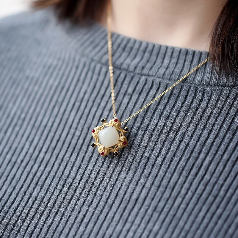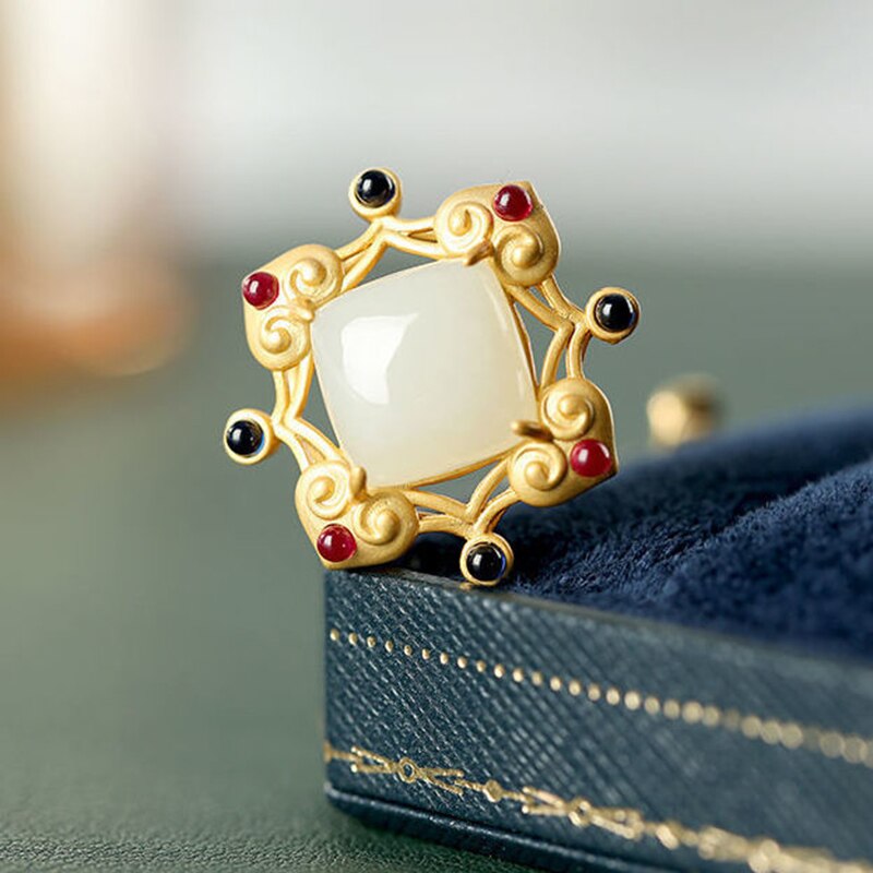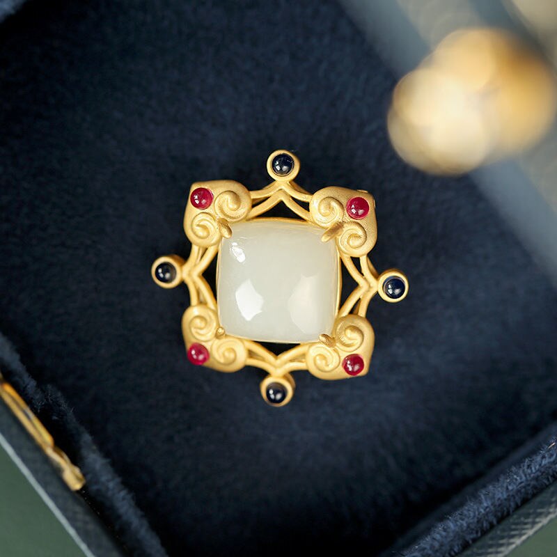 Brooches -Unique design craftsmanship gold-plated inlaid natural Hetian jade geometric hollow heart brooch pendant dual-use ladies jewelry