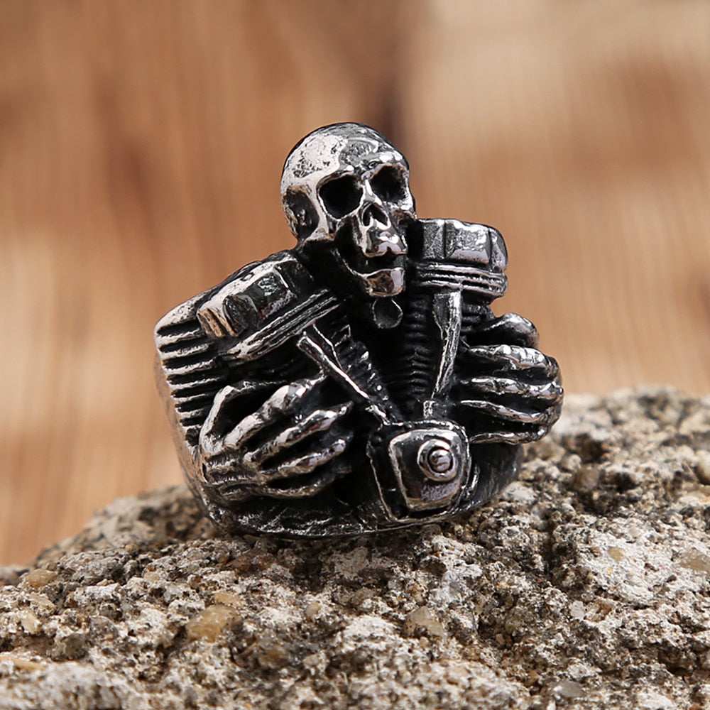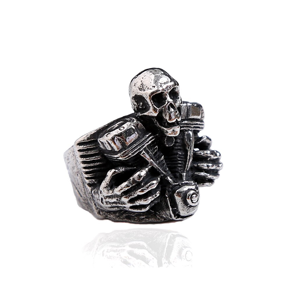 Vintage 316L Stainless Steel Steampunk Motorcycle Engine Skull Rings For Men