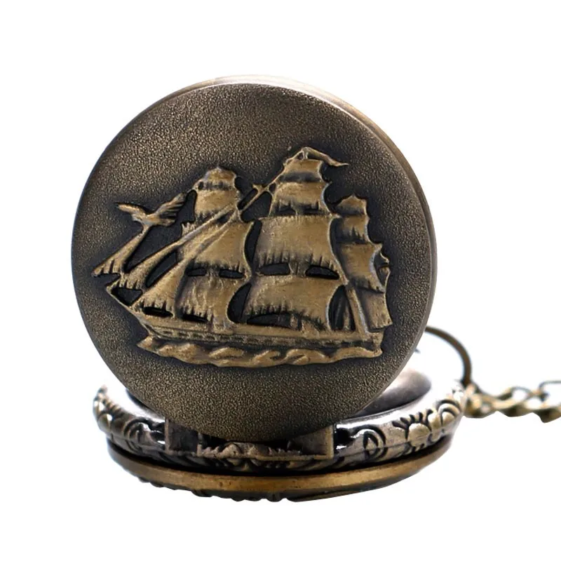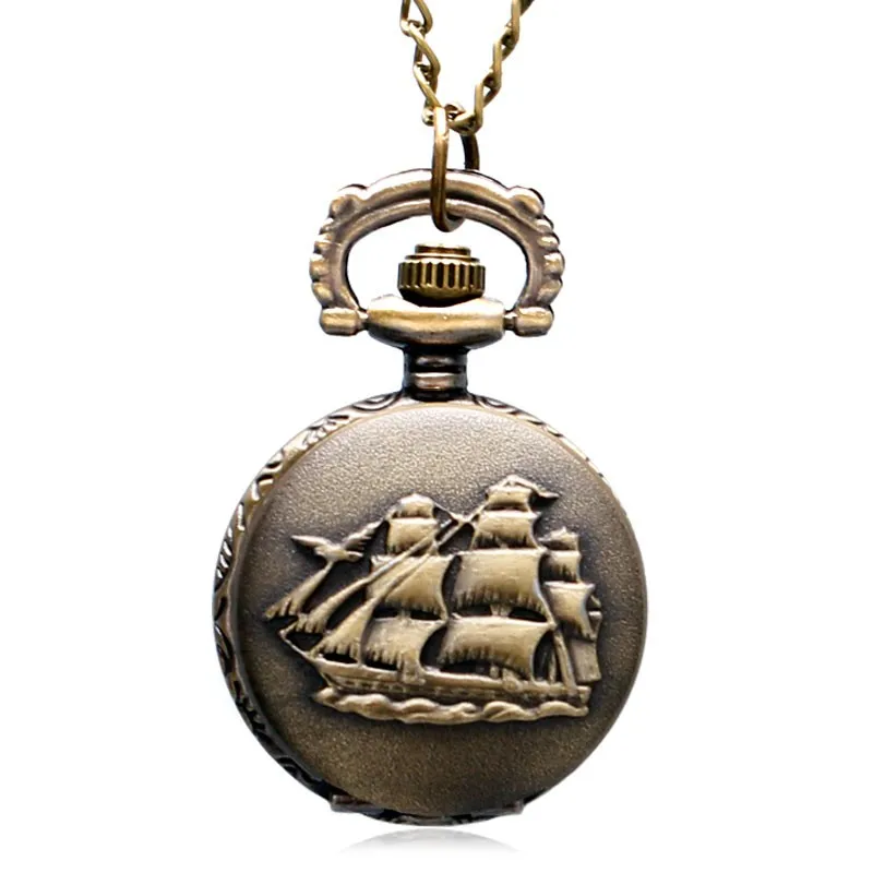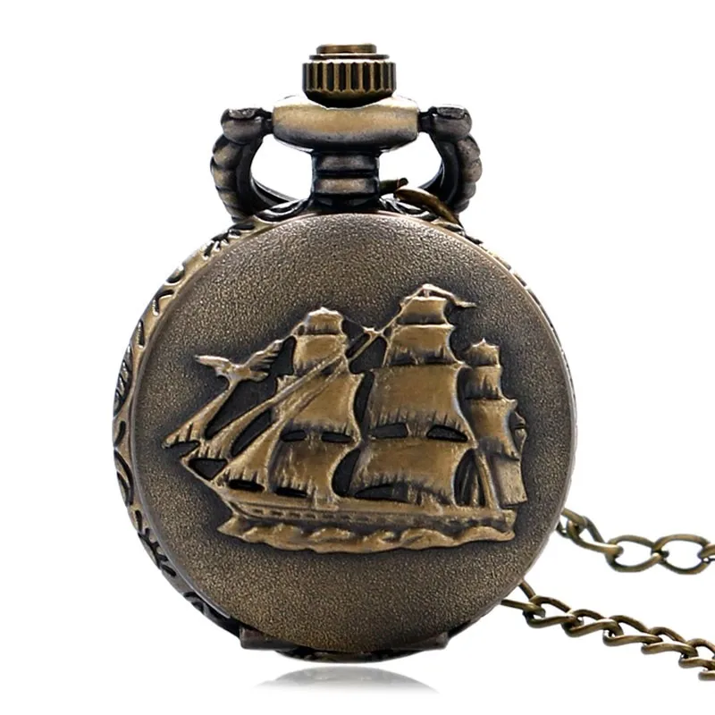 Pocket & Fob Watches-Vintage Bronze Retro Bronze 3D Sailboat Design Small Size Quartz Pocket Watch With Sweater Necklace Chain To Women