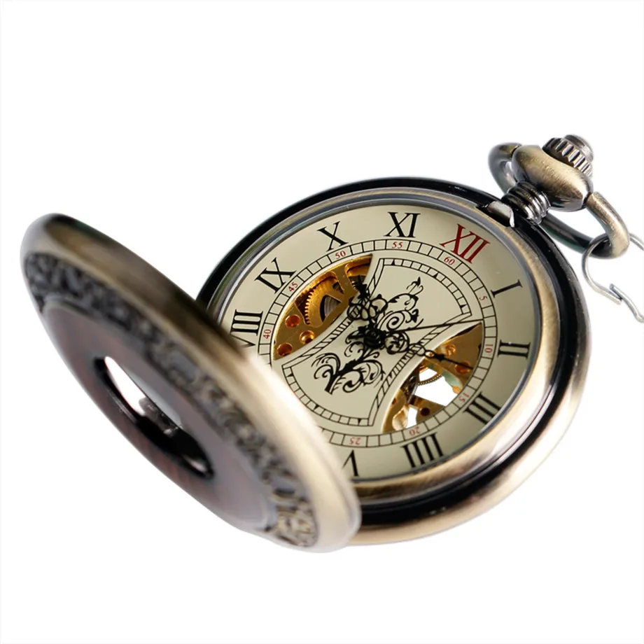 Vintage Wood Mechanical Roman Numerals Creative Carving Flower Dial Pocket Watch