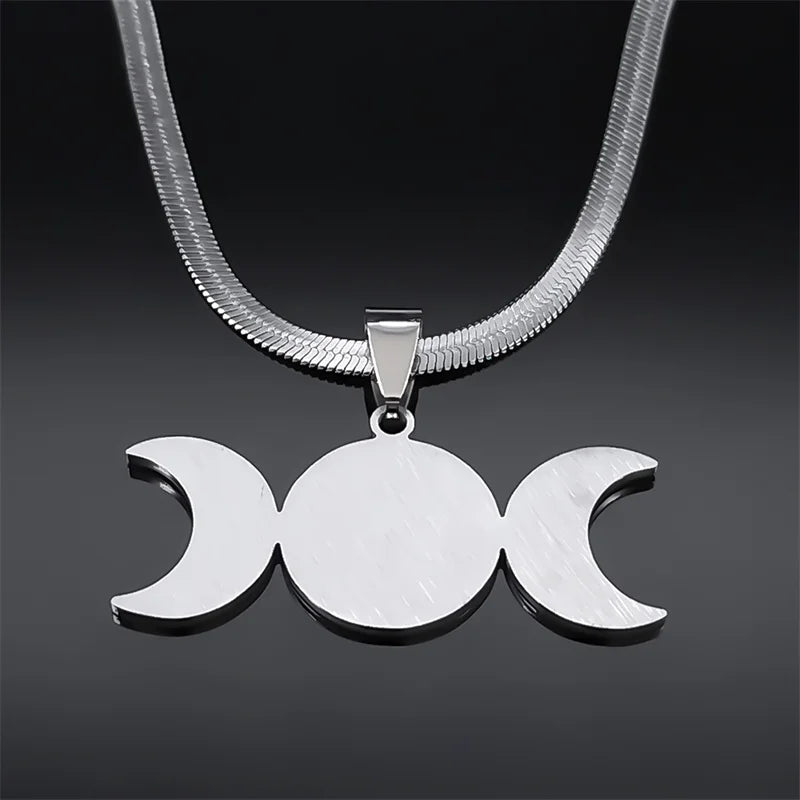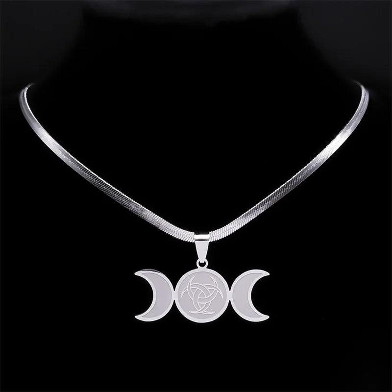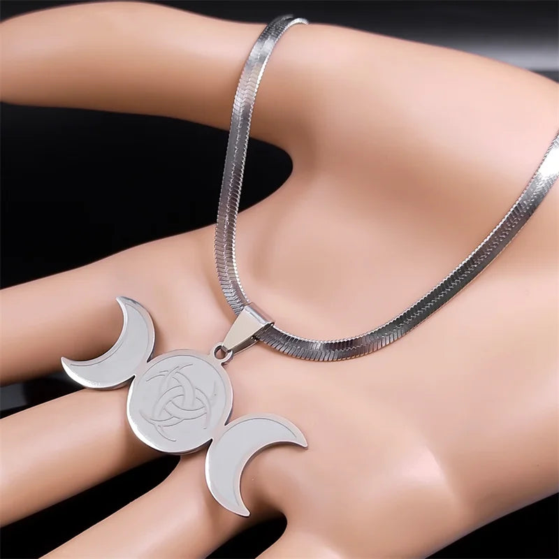 Witch Triple Crescent Moon Goddess Necklace for Women Stainless Steel Silver Color Wicca Pagan Woman Necklaces Jewelry collier