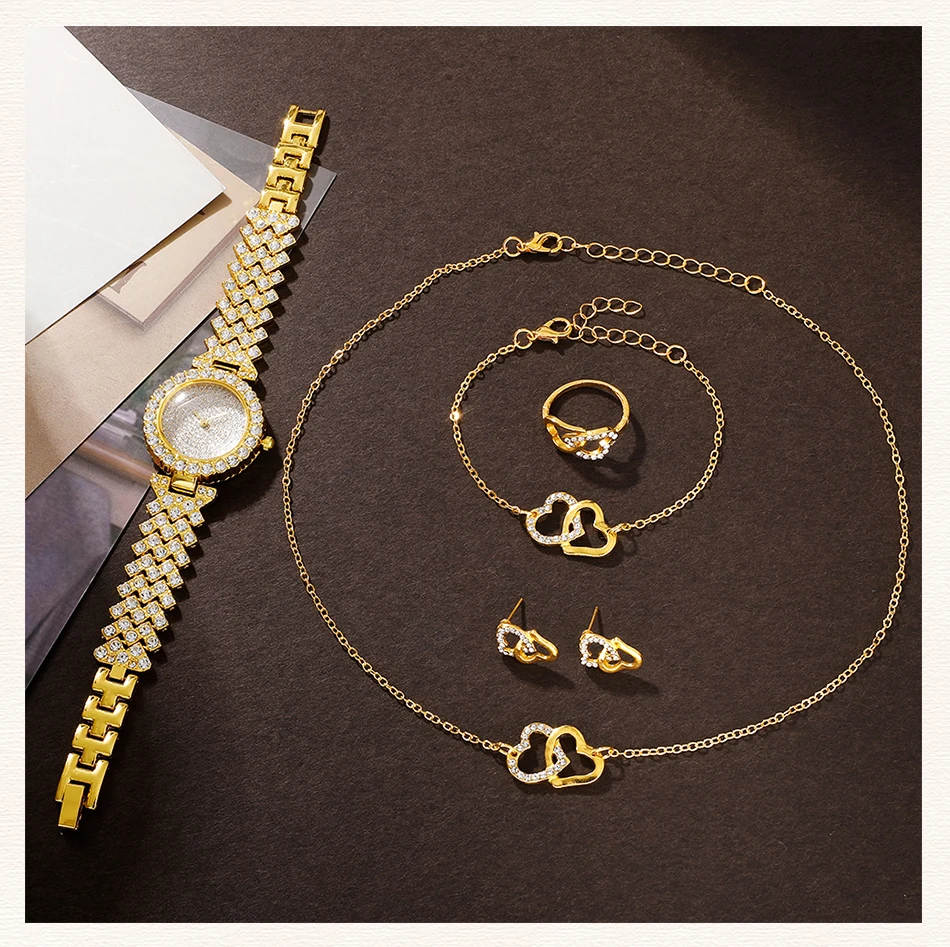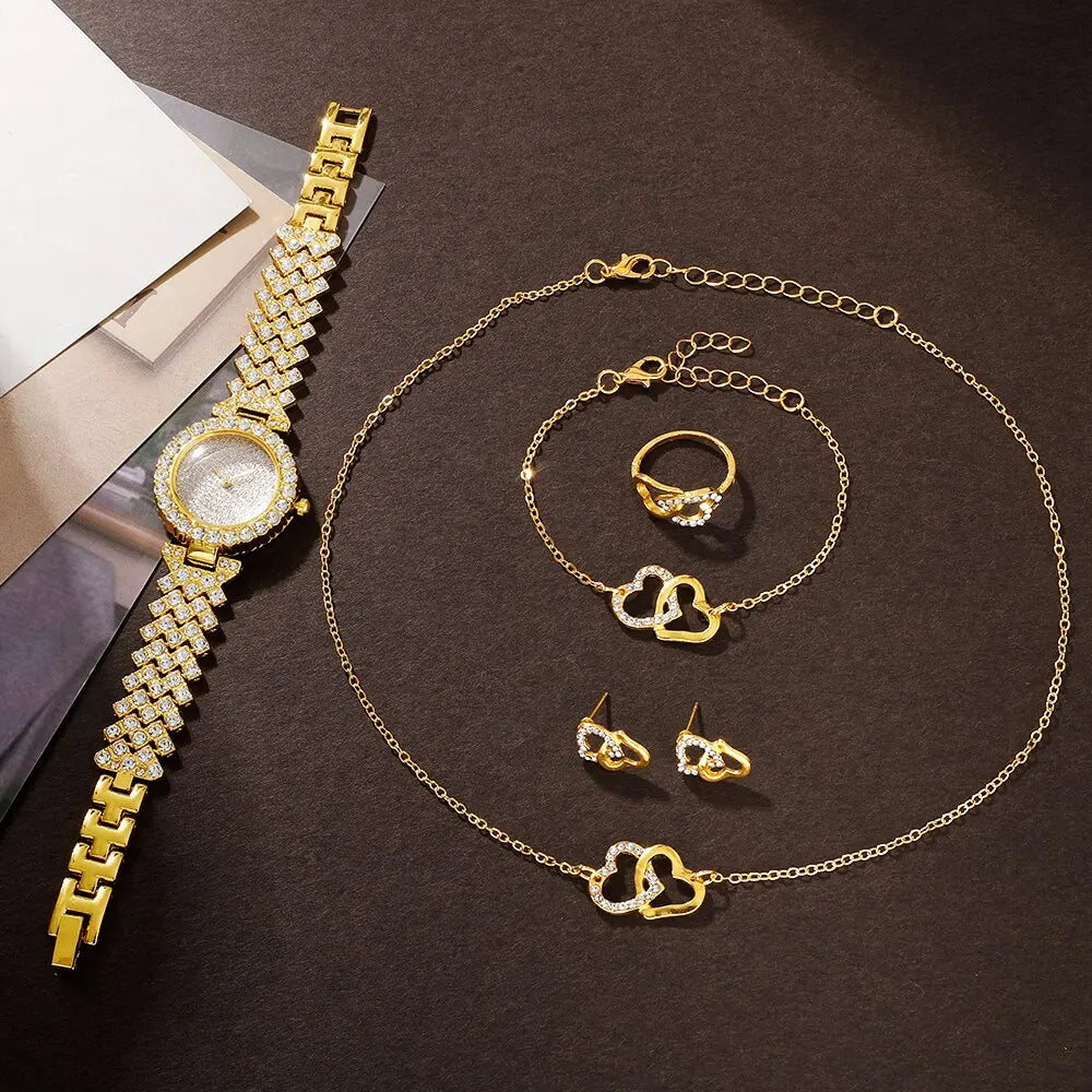 Women Dainty Quartz Watch With Heart Jewelry Set For Women Rhinestone Watch Double Heart Necklace Bracelet Earrings Ring Set