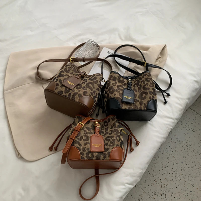 Women's New Fashion Leopard Print Messenger Bags Popular Texture Retro Bucket Crossbody Bag Multi-function Versatile Satchel